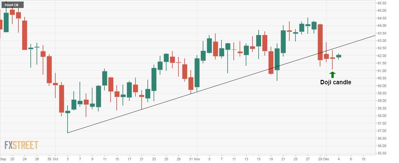 On the flip side, a close below Doji's low of $60.32 would validate the downside break of the ascending trendline and will likely yield a sell-off to $58.63 (Oct. 31 low).