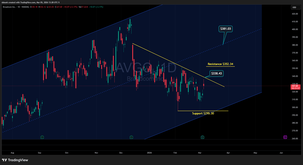 The technical setup for AVGO began with a sharp "flag pole" rally originating from the February 4th low pivot. The vertical ascent following that pivot established the momentum, while the sideways-to-downward drifting price action since then has carved out the "flag" portion of the pattern.