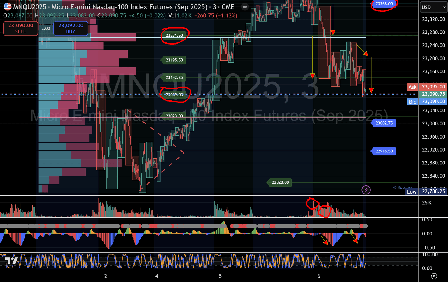 High-volume flip at micro 5 (23,271) in the E-mini Micro Nasdaq sparks rapid unwind through successive pivots, underscoring multi-timeframe supply and demand dynamics.