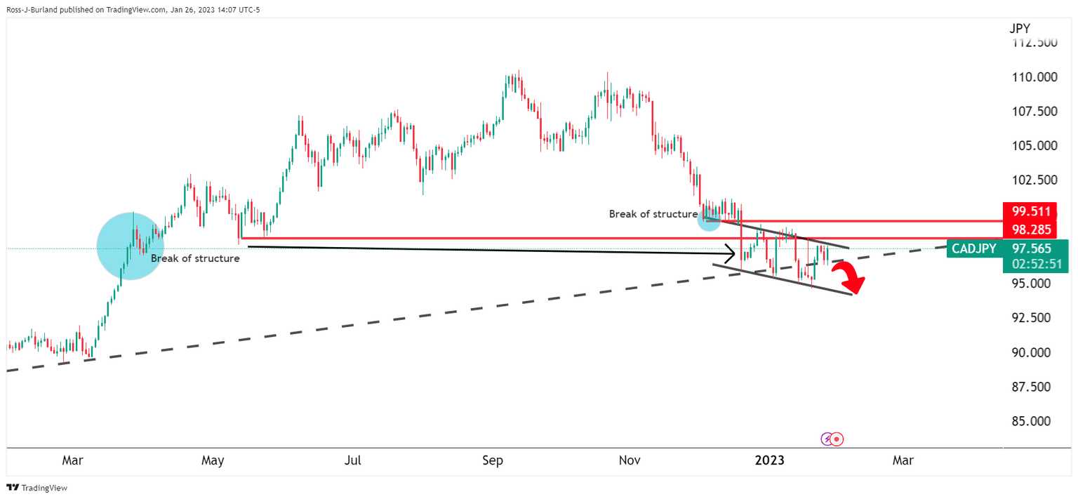 - CAD/JPY bulls are moving in but there are downside prospects.