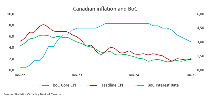 Previewing the data release, analysts at BBH note: “Canada highlight will be January CPI data Tuesday. Headline is expected at 1.9% y/y vs. 1.8% in December, core median is expected to remain steady at 2.4% y/y, and core trim is expected at 2.6% y/y vs. 2.5% in December. The GST/HST holiday (from December 14, 2024 to February 15, 2025) will pull down inflation in January, particularly in categories such as food services and semi-durable goods. The Bank of Canada projects headline and core CPI inflation to average 2.1% and 2.5% over Q1, respectively. The BoC has room to ease further, though at a more gradual pace because inflation has been around 2% since August. The market is pricing in 50 bp of easing over the next 12 months that would see the policy rate bottom at 2.50%”.