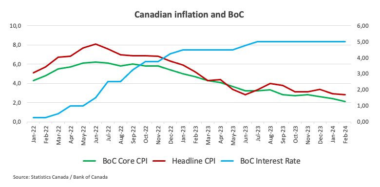 On Tuesday at 12:30 GMT, Canada is set to release the Consumer Price Index for February. The Canadian Dollar's potential response is tied to changes in monetary policy expectations by the Bank of Canada. However, barring any real surprise in either direction, the BoC is unlikely to change its current cautious monetary policy stance, in line with other central banks such as the Federal Reserve (Fed).