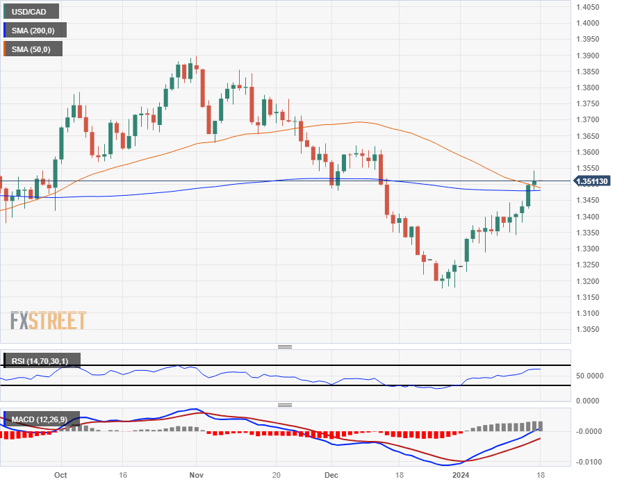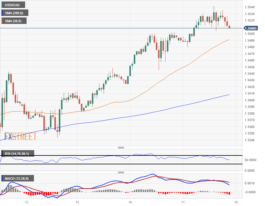 The Canadian Dollar saw further declines against the US Dollar, with the USD/CAD hitting a five-week high of 1.3540. Intraday momentum is leaning into the top side as US Dollar strength continues to push the pair higher. In the near term, the USD/CAD is trading well above the 200-hour Simple Moving Average (SMA) near 1.3400.