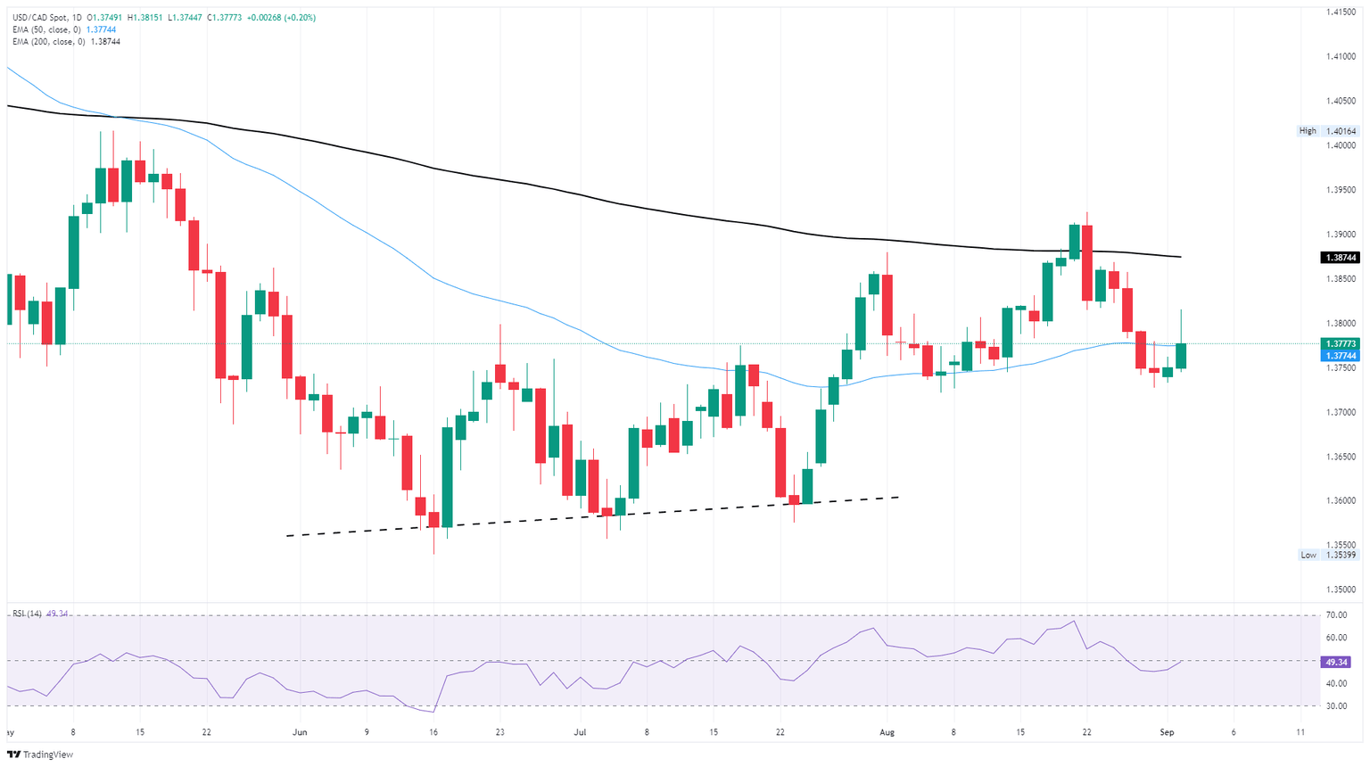 Tuesday’s bearish plunge in the Canadian Dollar has bolstered USD/CAD bids, sending the pair back into the 50-day Exponential Moving Average (EMA) as bullish pressure behind the Loonie dries up. A sharp adjustment to global risk appetite to kick off September has sent the safe-haven US Dollar higher, and USD/CAD is now challenging the 1.3800 once again.