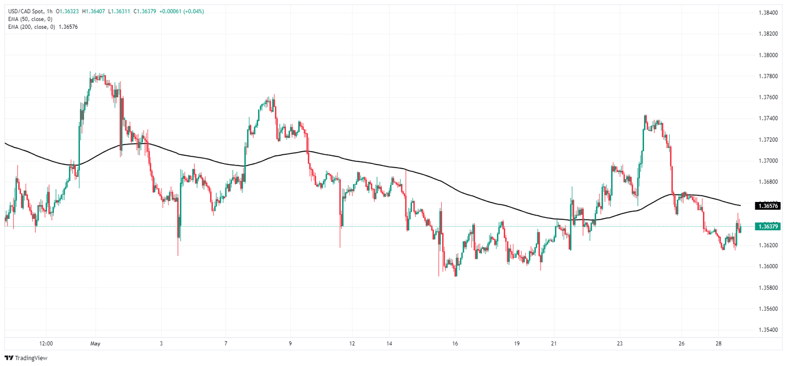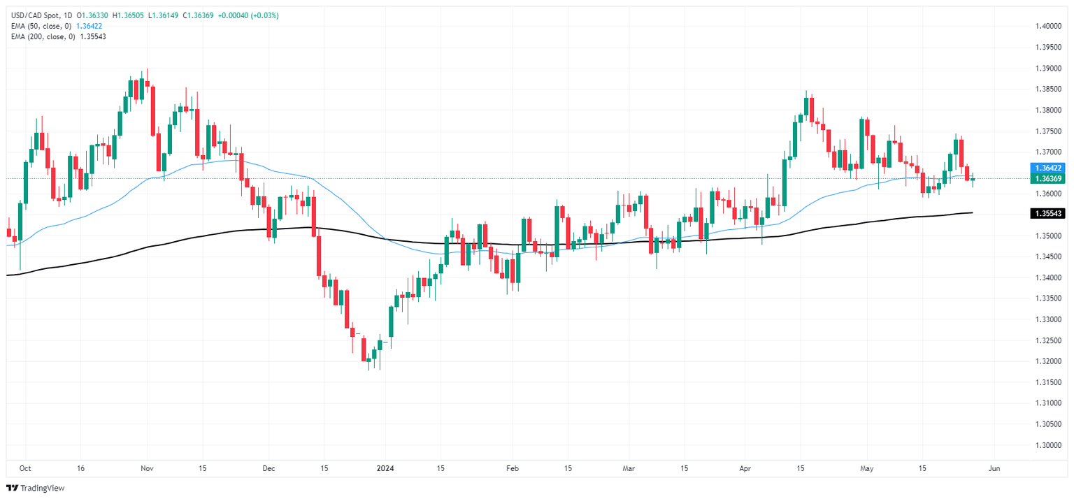 USD/CAD rebounded to test 1.3650 after arresting a decline below 1.3620, and the 1.3600 handle is firming into a technical barrier rather than a target for short pressure. The pair is still down 0.8% from last week’s peak just above 1.3740, and daily candlesticks are mired in technical congestion near the 50-day Exponential Moving Average (EMA) at 1.3642.