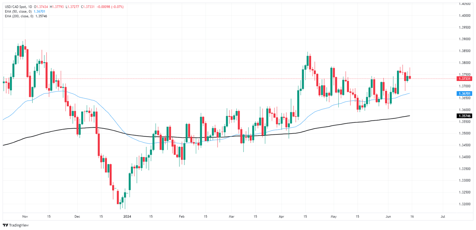 USD/CAD climbed to the 1.3780 region on Friday before slipping back to familiar territory below 1.3740. The pair continues to trade above the 200-hour Exponential Moving Average (EMA), but volatility remains high. Consolidation continues to weigh on daily candlesticks, though USD/CAD has managed to trade on the north side of the 200-day EMA at 1.3575 since early April.