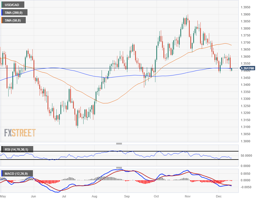 A bounce from the 200-day SMA for the USD/CAD at the start of December has failed to crystallize into a meaningful bullish recovery, keeping the pair constrained in a congestion zone just beneath the 1.3600 handle. The pair is now falling back into the 200-day SMA.