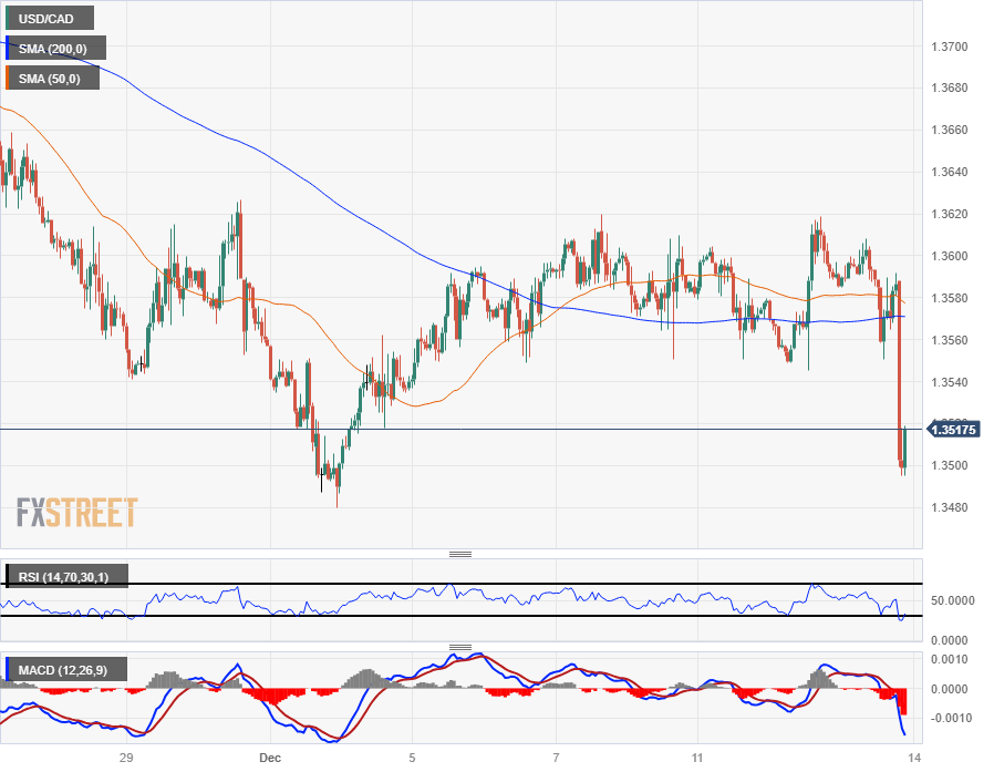 The Canadian Dollar (CAD) saw choppy trading forming into a near-term sideways channel against the US Dollar (USD), keeping the USD/CAD capped between 1.3610 and 1.3550 before Wednesday's blowout Fed showing sent the pair back into the 1.3500 handle. Intraday action has turned firmly bearish, sending the pair tumbling clean through the 200-hour Simple Moving Average (SMA) near 1.3570.