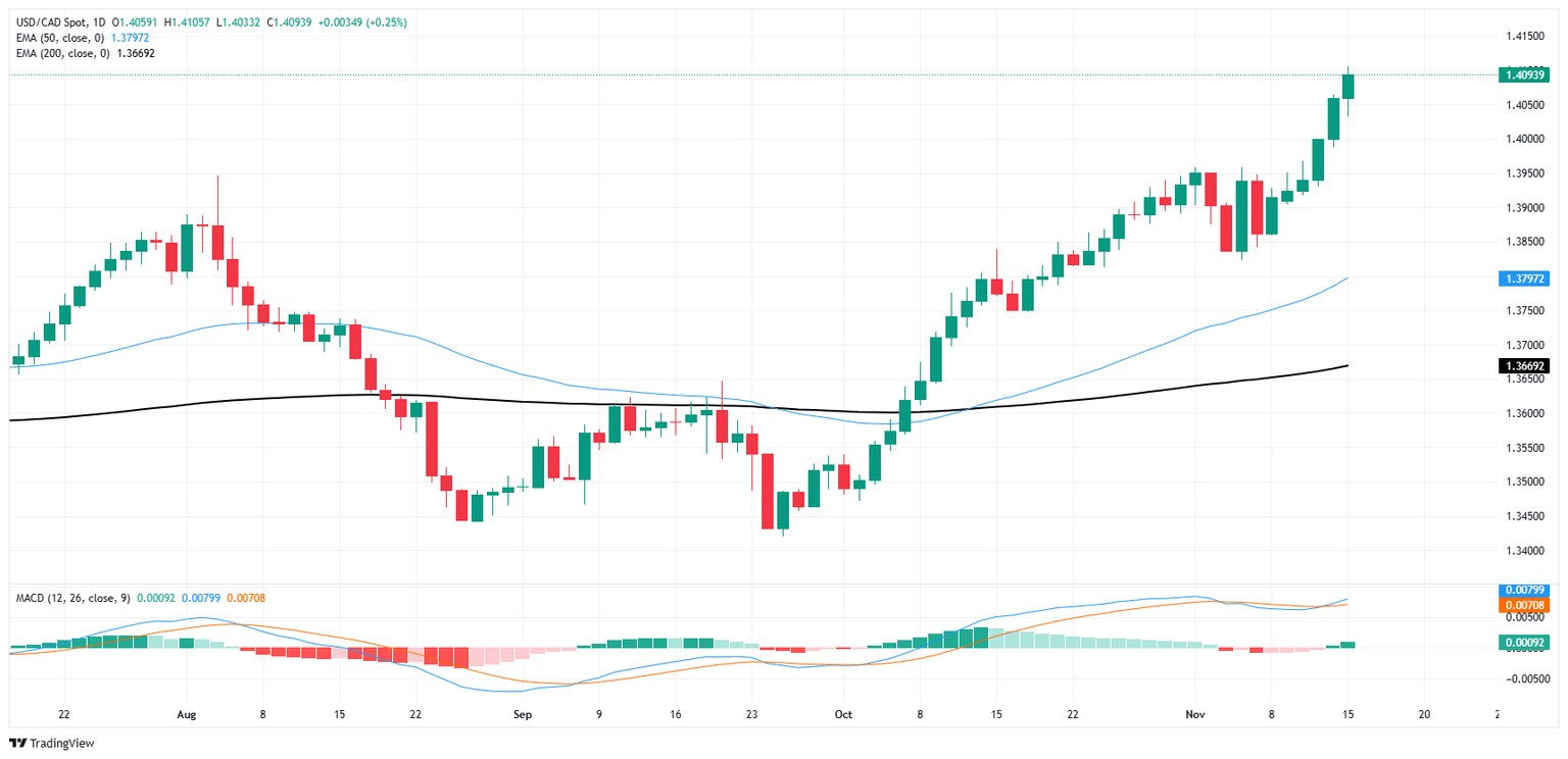 The sky’s the limit as the Canadian Dollar (CAD) continues to shed weight against the Greenback; USD/CAD’s fresh push into multi-year highs has the pair testing bids just shy of 1.4100. The pair is on pace to close in the green for a sixth consecutive trading day as the CAD recedes against the US Dollar.