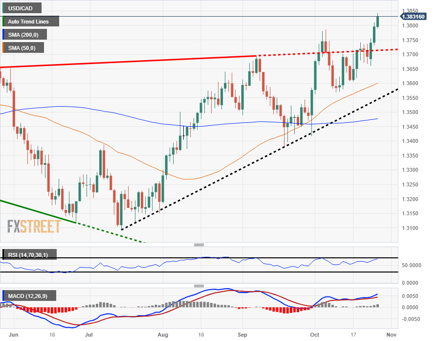The Canadian Dollar (CAD) is struggling to find a foothold against its close neighbor and currency counterpart as markets pile into the US Dollar (USD) across the board. The USD/CAD is extending Wednesday’s break of the 1.3800 handle, and the pair is now making a run at 2023’s high bid of 1.3861.
