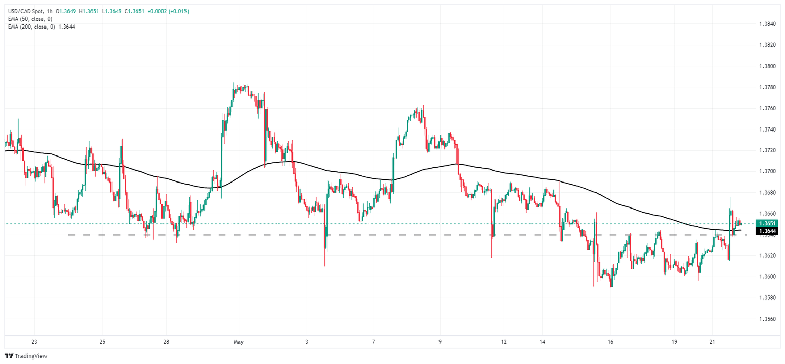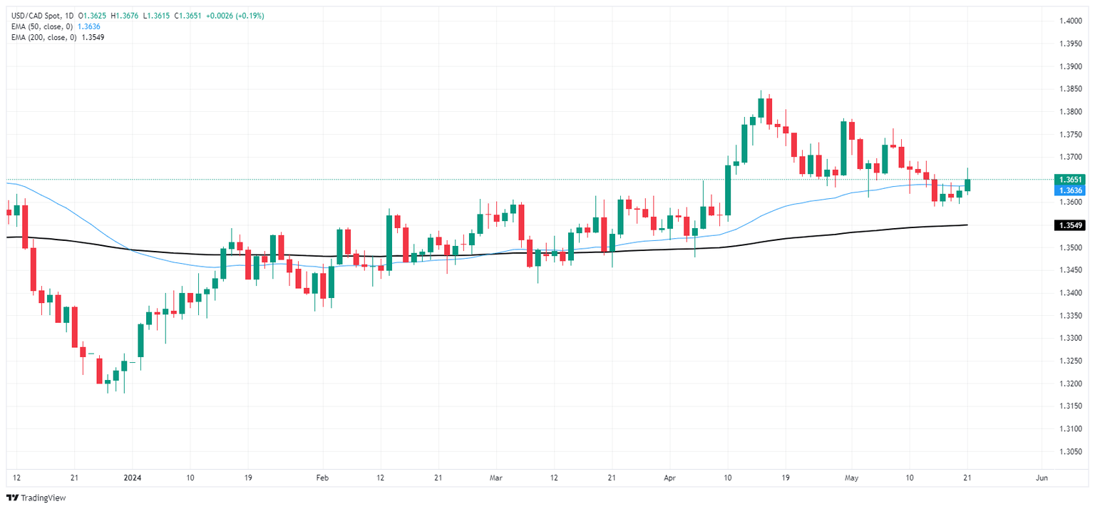 USD/CAD rose to its highest bids in a week, threatening to solidify a bullish rejection from the 50-day Exponential Moving Average (EMA) from 1.3636. The pair is still down from last month’s peak bids near 1.3850, but a long-term technical floor is priced in at the 200-day EMA from 1.3549.