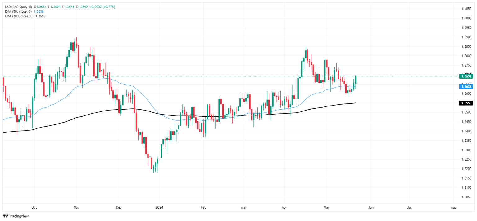 USD/CAD is on pace for a third straight daily gain as the pair firms up on a technical recovery from the 50-day Exponential Moving Average (EMA) at 1.3637. The 1.3640 level remains a key technical barrier, and buyers will be looking to launch another leg higher if bids fall back to the middle zone.