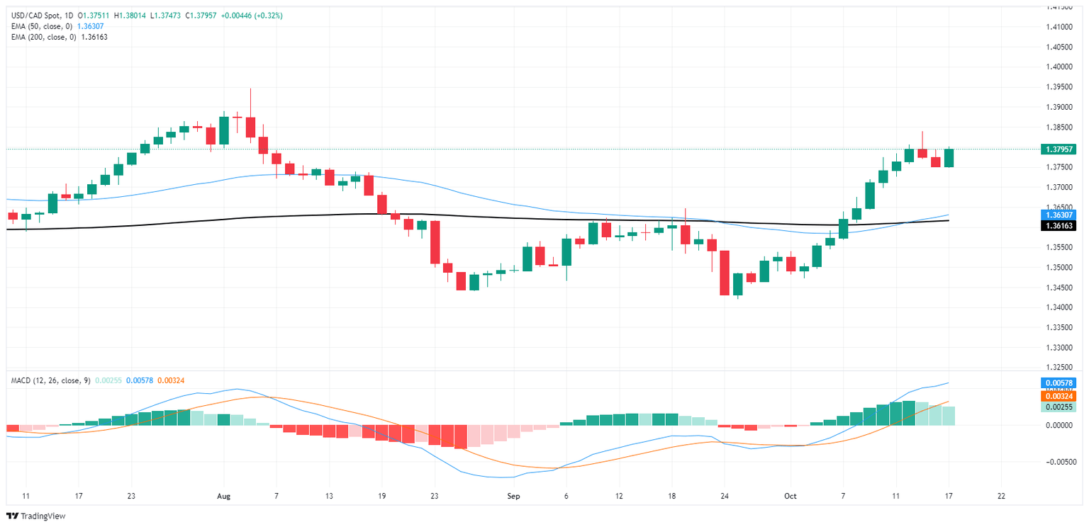 The USD/CAD pair has shown a robust bullish movement recently, with the price breaking above the 50-day Exponential Moving Average (EMA), which is currently at 1.3631, and trading above the 200-day EMA at 1.3615. The pair has found short-term resistance near the 1.3800 psychological level, after testing highs around 1.3801. However, it has yet to confirm a breakout above this level. The sustained bullish momentum is also supported by the upward slope of the 50-day EMA, which is approaching a bullish crossover with the 200-day EMA, suggesting further upside potential if the price can clear the immediate resistance.