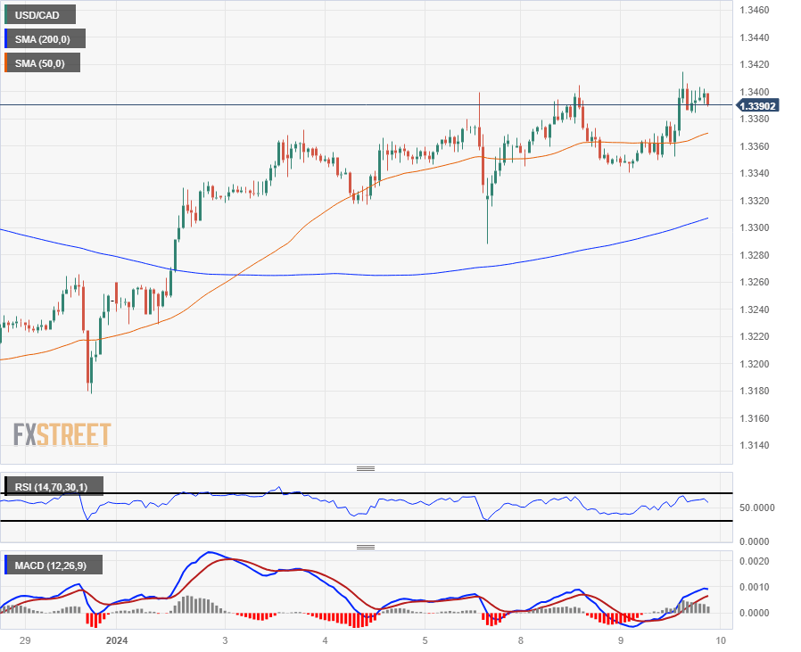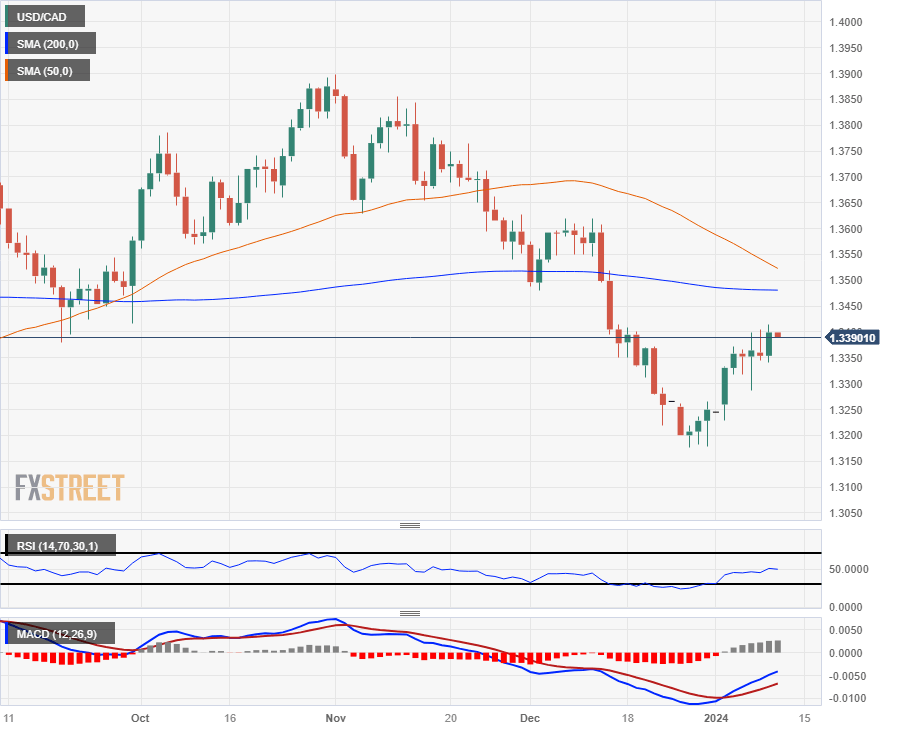 The Canadian Dollar (CAD) slid to a new multi-week low against the US Dollar on Tuesday, sending the USD/CAD pair briefly back over the 1.3400 price level before intraday price action got hung up on the major handle. Near-term USD/CAD momentum has largely been a consolidation story with the pair grinding out higher lows through 2024’s early trading.