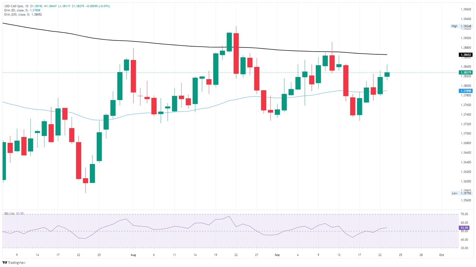 A fresh bout of weakness in the Canadian Dollar has pushed the USD/CAD pair back above the 50-day Exponential Moving Average (EMA) near 1.3790. Despite near-term losses, the Canadian Dollar is still firmly entrenched in back-and-forth chart chop on daily candlesticks, with the 200-day EMA weighing down on further topside momentum in the USD/CAD pair from 1.3865.
