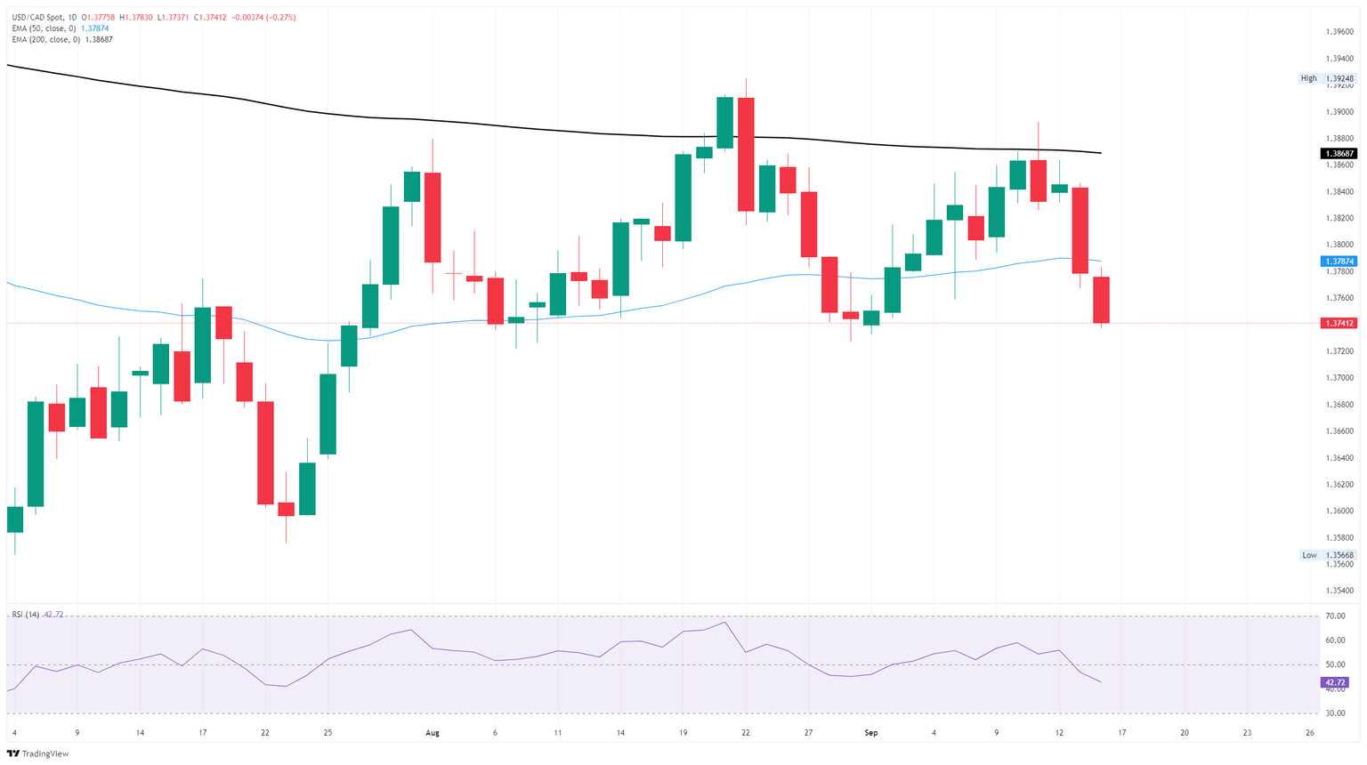 - USD/CAD has tumbled back into August’s lows near 1.3740.