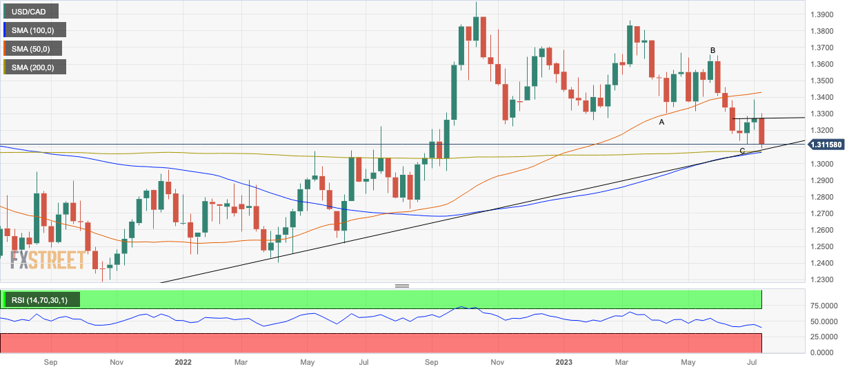 USD/CAD has fallen to a tough confluence of support at around 1.3100 and bounced on Friday.