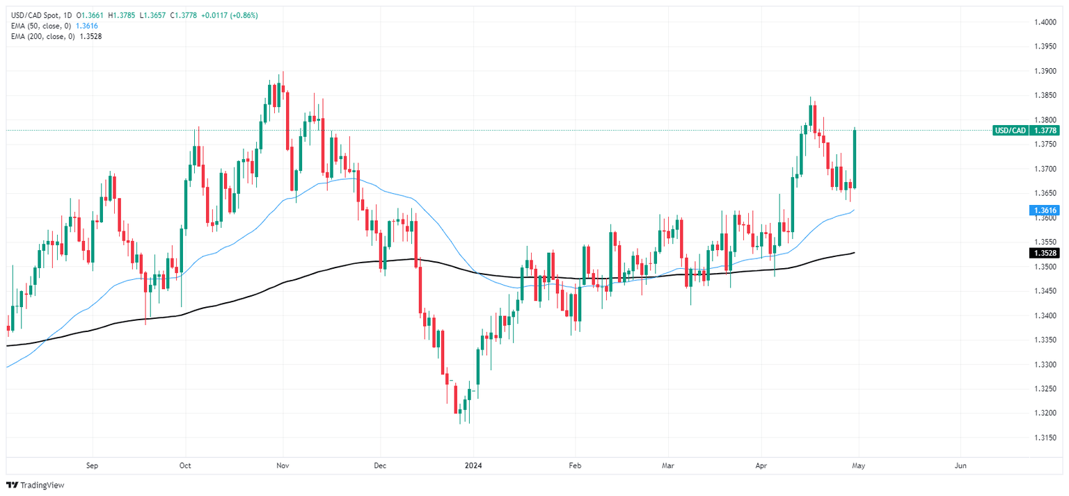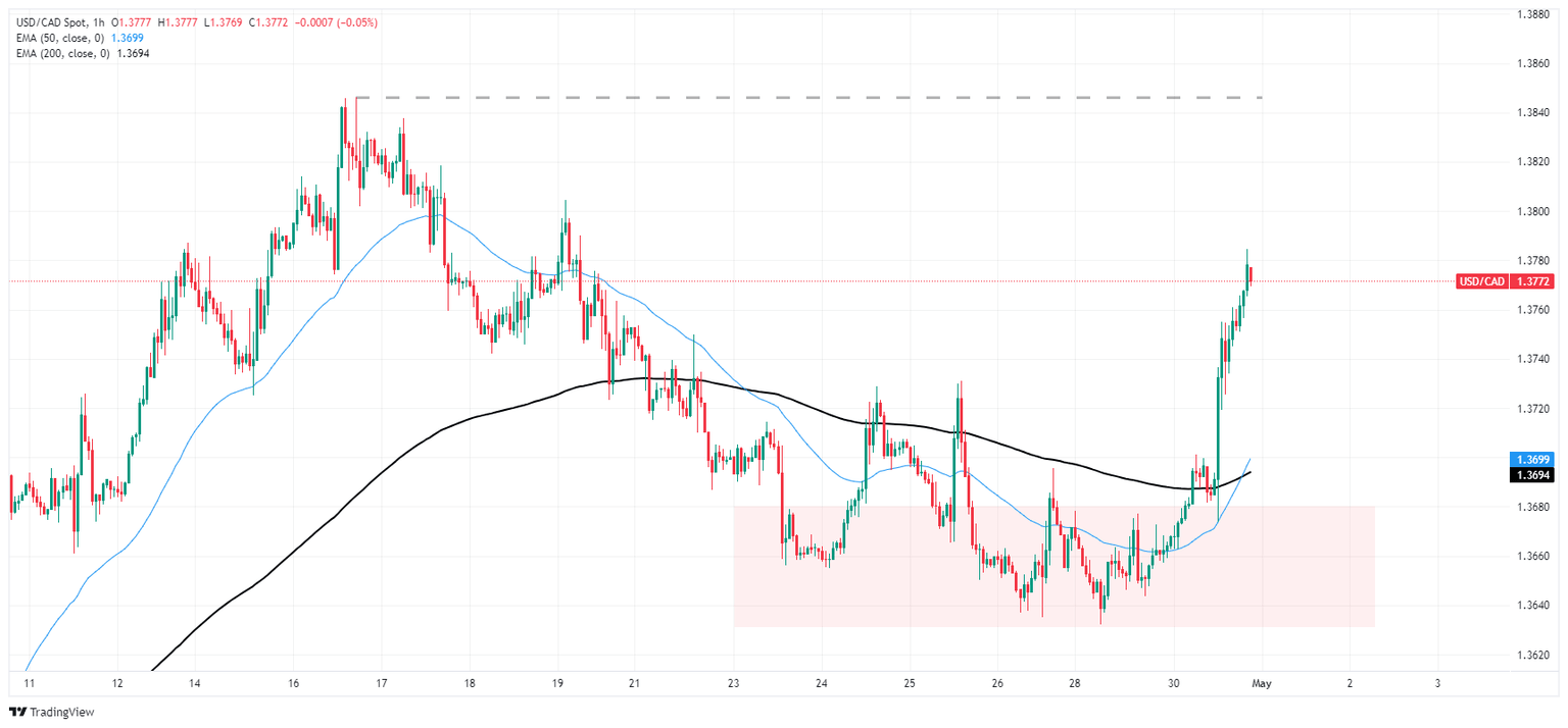 USD/CAD broke into a fresh five-day high during Tuesday’s US market session, challenging the 1.3750 region as the pair bounces from a heavy supply zone between 1.3680 and 1.3630. Bids are still down from the last swing high into 1.3845, but buyers are pushing back into chart territory north of the 200-hour Exponential Moving Average (EMA) at 1.3688.