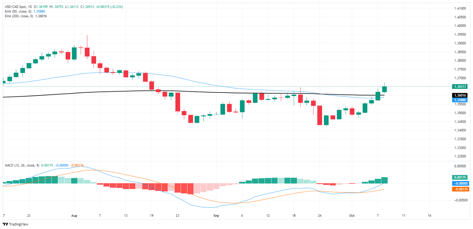 The USD/CAD daily chart shows a clear upward momentum that has developed in recent trading sessions. The price has moved above both the 50-day Exponential Moving Average (EMA) at 1.35880 and the 200-day EMA at 1.36048, which often signals a potential trend shift or the continuation of a bullish trend. Breaking these key moving averages is a significant technical indicator suggesting that bullish sentiment is building in the market. The price is now hovering around 1.36515, a level that could act as a short-term resistance point.