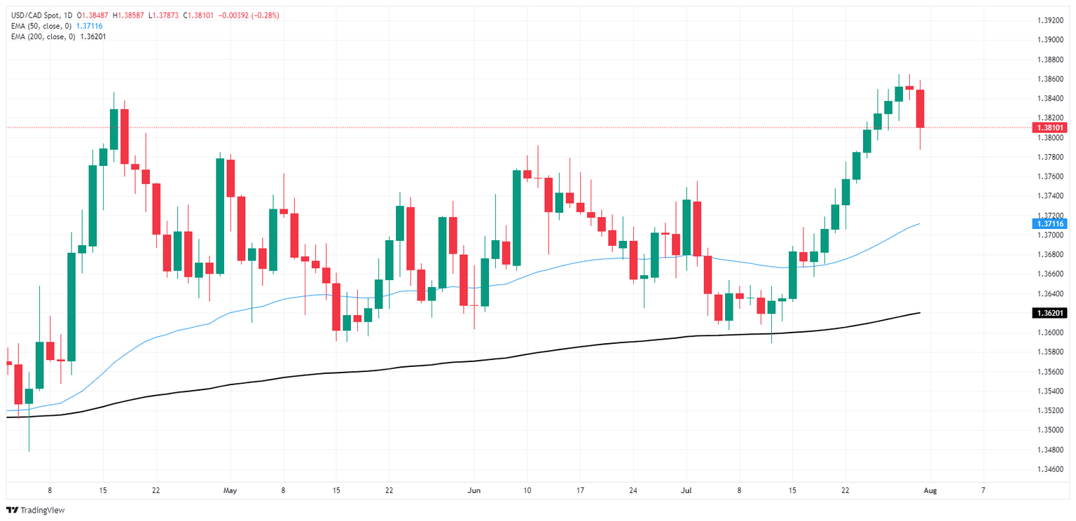 USD/CAD priced in a firmly downside candlestick for the first time in almost 20 trading days, falling back into the 1.3800 handle as the US Dollar snaps a bullish streak against the Canadian Dollar that dragged the pair up a full two percent bottom-to-top. The Greenback’s rally against the CAD dragged the pair into fresh highs for 2024, testing price levels last seen in November of last year.