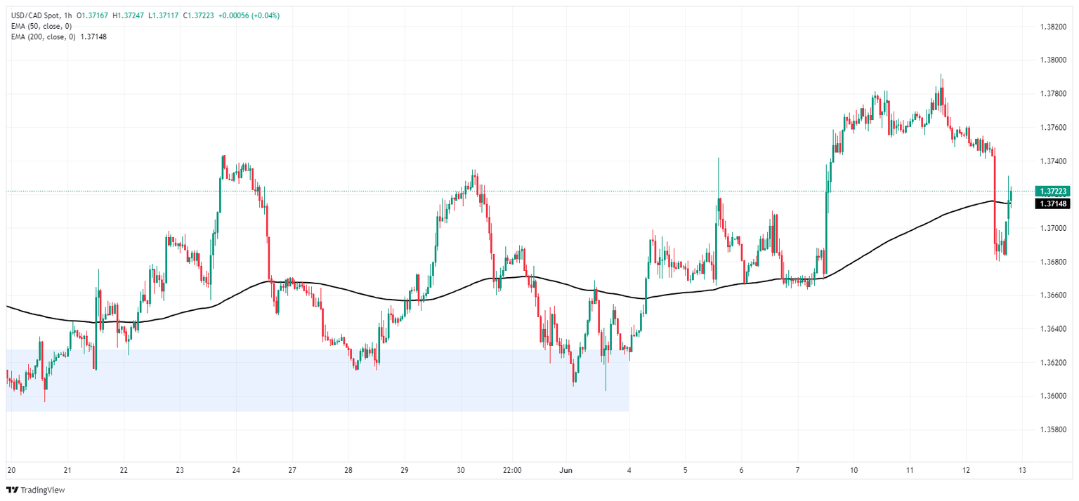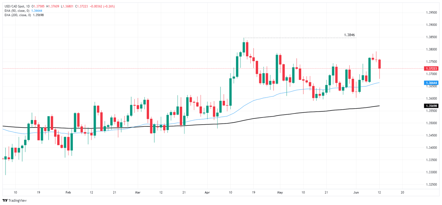 USD/CAD backslid half of a percent on Wednesday, falling back below 1.3750 as the pair routinely fails to drive further north of the 50-day Exponential Moving Average (EMA) at 1.3663. A drop below key technical levels will see the pair extend declines into a near-term demand zone below 1.3630, where a price floor at the 1.3600 handle is waiting.
