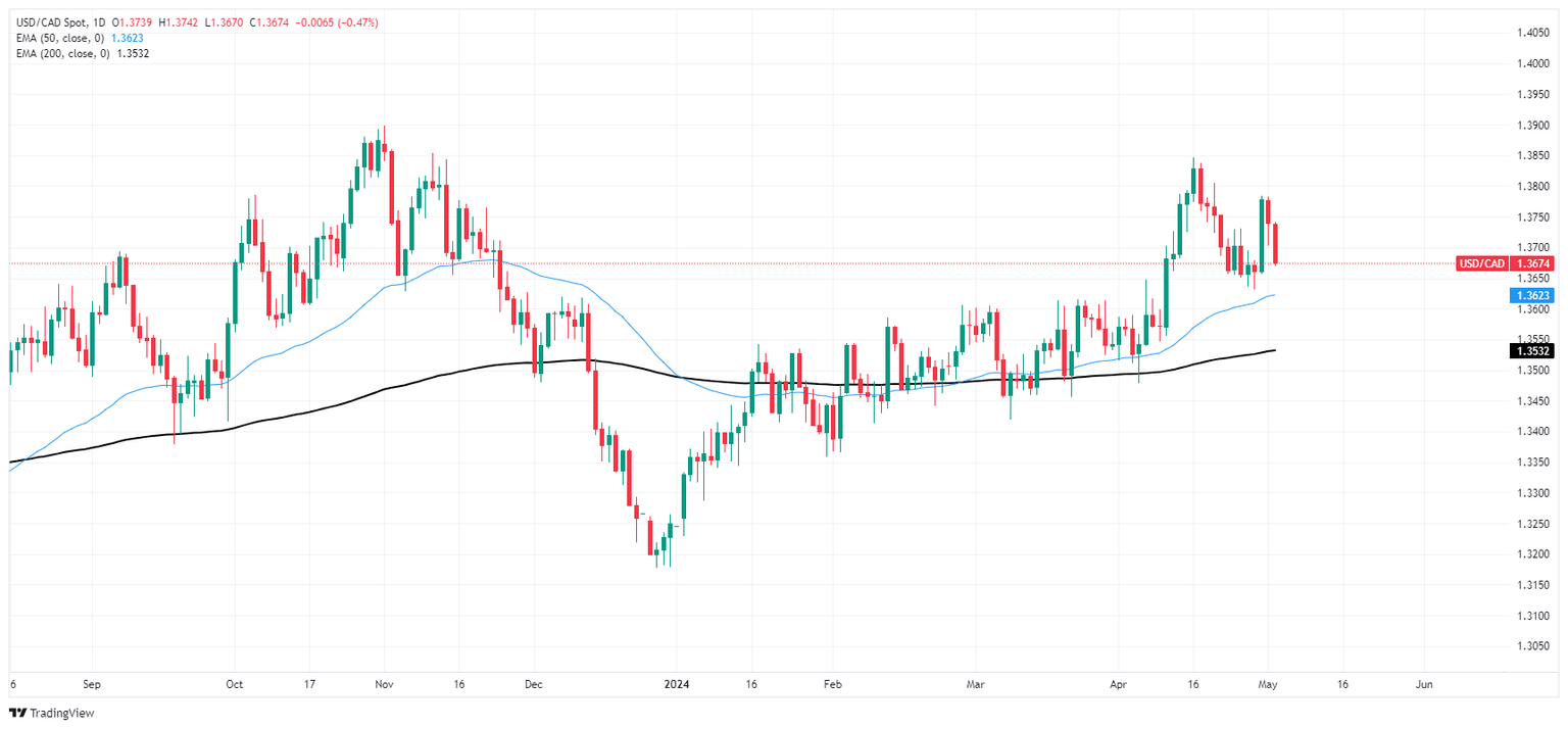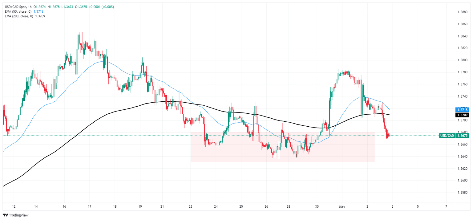 USD/CAD has fallen back below the 200-hour Exponential Moving Average (EMA) at 1.3709. The pair is testing chart territory below the 1.3700 handle, and is approaching a near-term demand zone between 1.3660 and 1.3630.