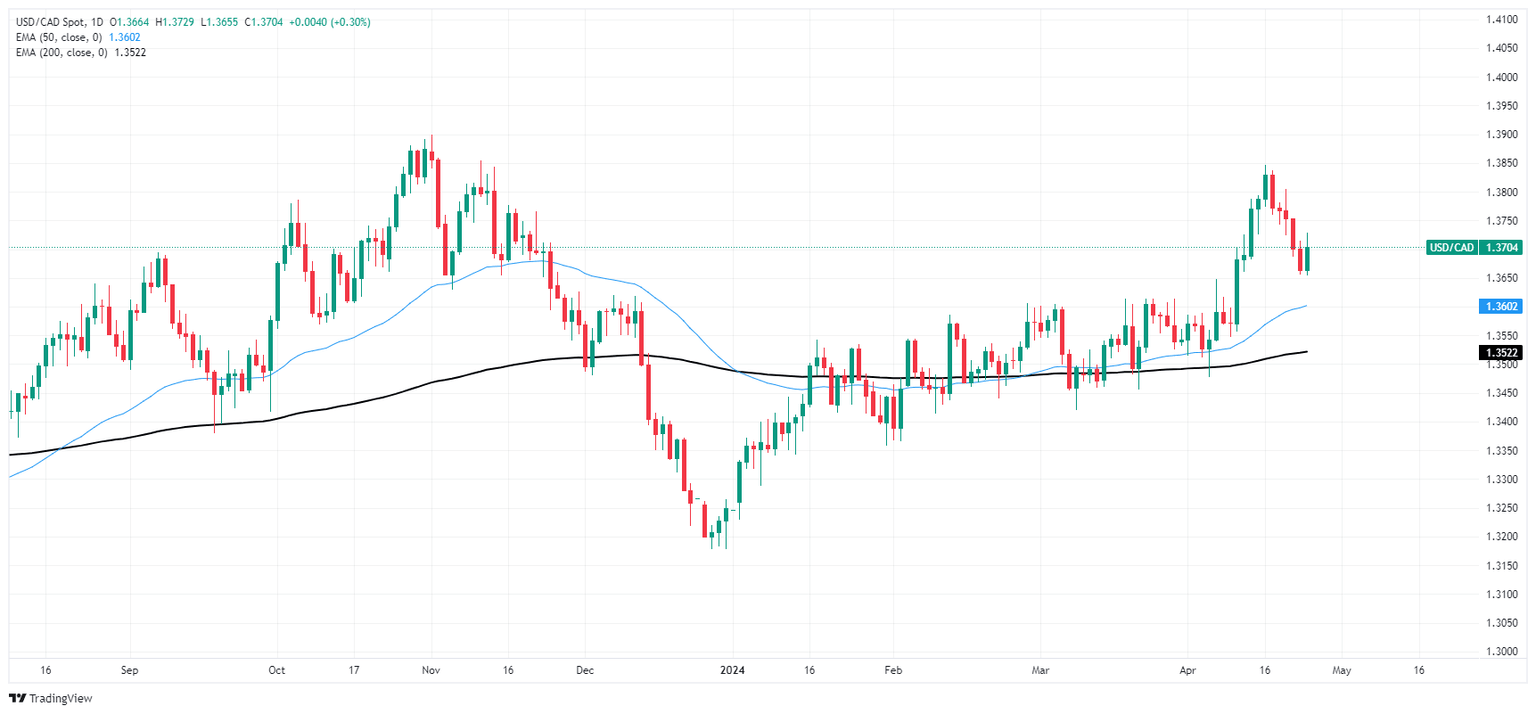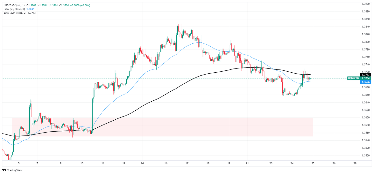 The USD/CAD has risen back above the 1.3700 handle, testing chart territory north of the 200-hour Exponential Moving Average (EMA) near 1.3715. The pair bounced off the 1.3660 level to pare away Tuesday’s declines.