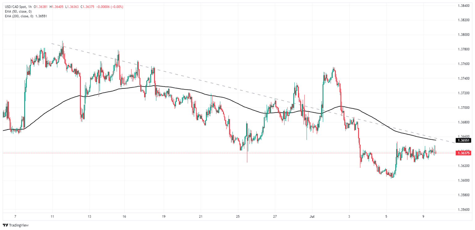 USD/CAD is stuck in place near 1.3640, treading water and moving in a tight cycle as the pair remains unable to break above 1.3650. Last week’s rebound from the last swing low towards 1.3600 failed to muscle the pair back above the 200-hour Exponential Moving Average (EMA) at 1.2656, but bidding pressure remains too high to allow a backslide into fresh lows.