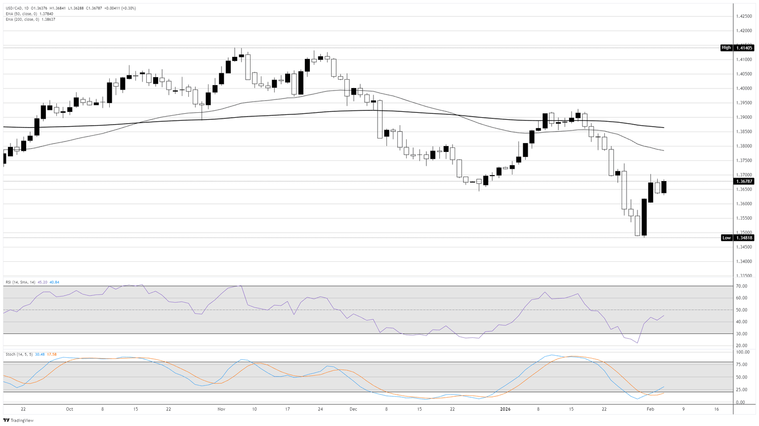 On the downside, initial support lies near 1.3600, followed by the 2025 swing low at 1.3540. A weekly close below that threshold would signal renewed bearish momentum and open the door to a test of 1.3430. On the upside, a clear break above the 1.3725-1.3735 zone would suggest a more significant low is in place, with subsequent resistance at the 1.3930-1.3970 area.