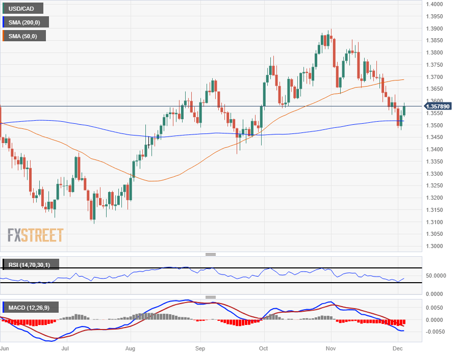 The USD/CAD set a new high for the week near 1.3590 before the Canadian Dollar pared away some of the day’s losses to land near 1.3560, and intraday price action remains capped by the 200-hour Simple Moving Average (SMA) dropping through the 1.3600 handle.