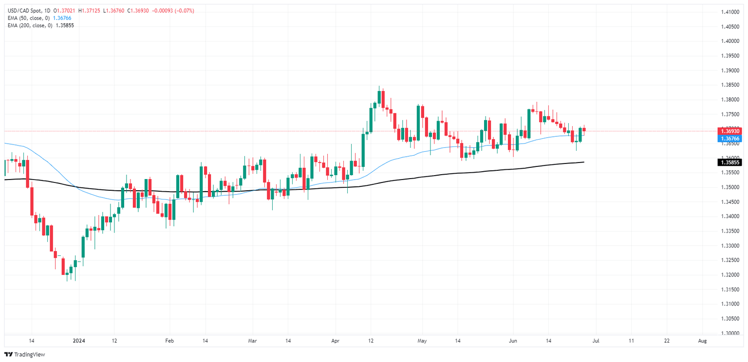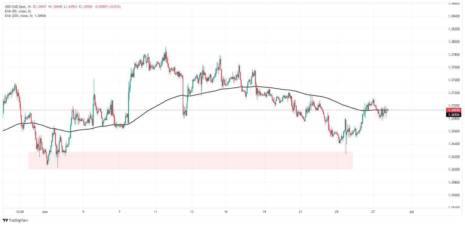 USD/CAD is stuck close to Thursday’s opening bids after an early dip to 1.3680. The pair remains stuck in a price action trap near the 1.3700 handle as intraday bids get hung up on the 200-hour Exponential Moving Average (EMA) at 1.3692.