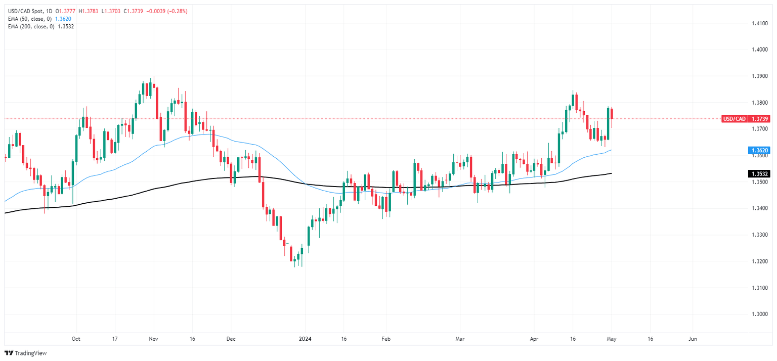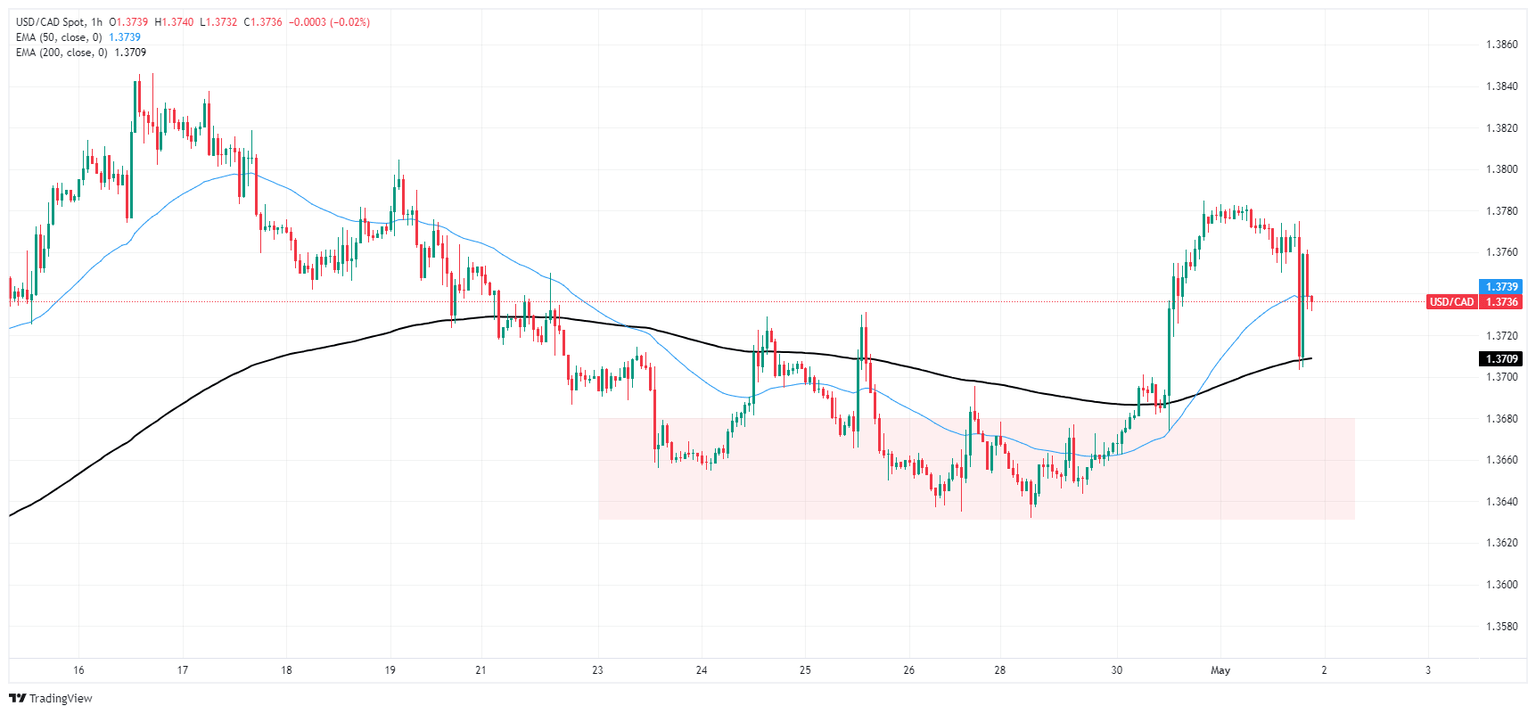 USD/CAD is down slightly from a near-term high around 1.3780, with an immediate technical floor at the 1.3700 handle. The 200-hour Exponential Moving Average (EMA) also provides topside technical support from 1.3707.