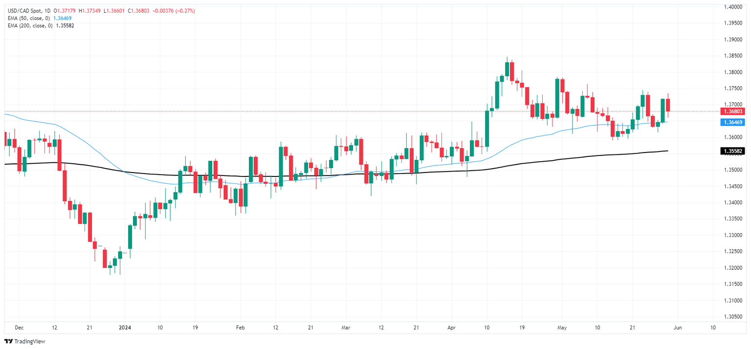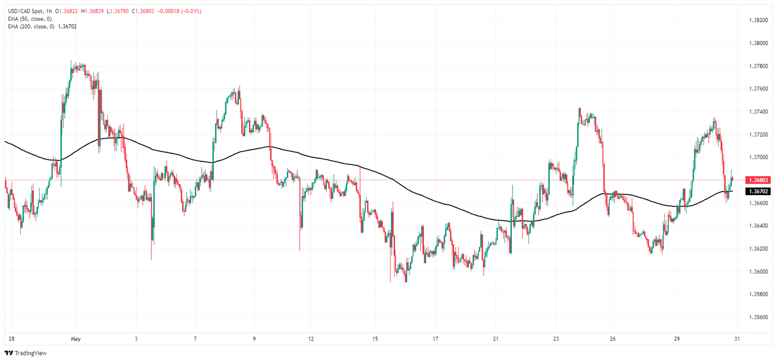 USD/CAD has fallen back to familiar levels near 1.3660 on Thursday in a quick turnaround from Wednesday’s peak near 1.3735. The pair is running into near-term technical resistance at the 200-hour Exponential Moving Average (EMA) at 1.3670, with an intraday floor priced in at this week’s swing low into 1.3615.