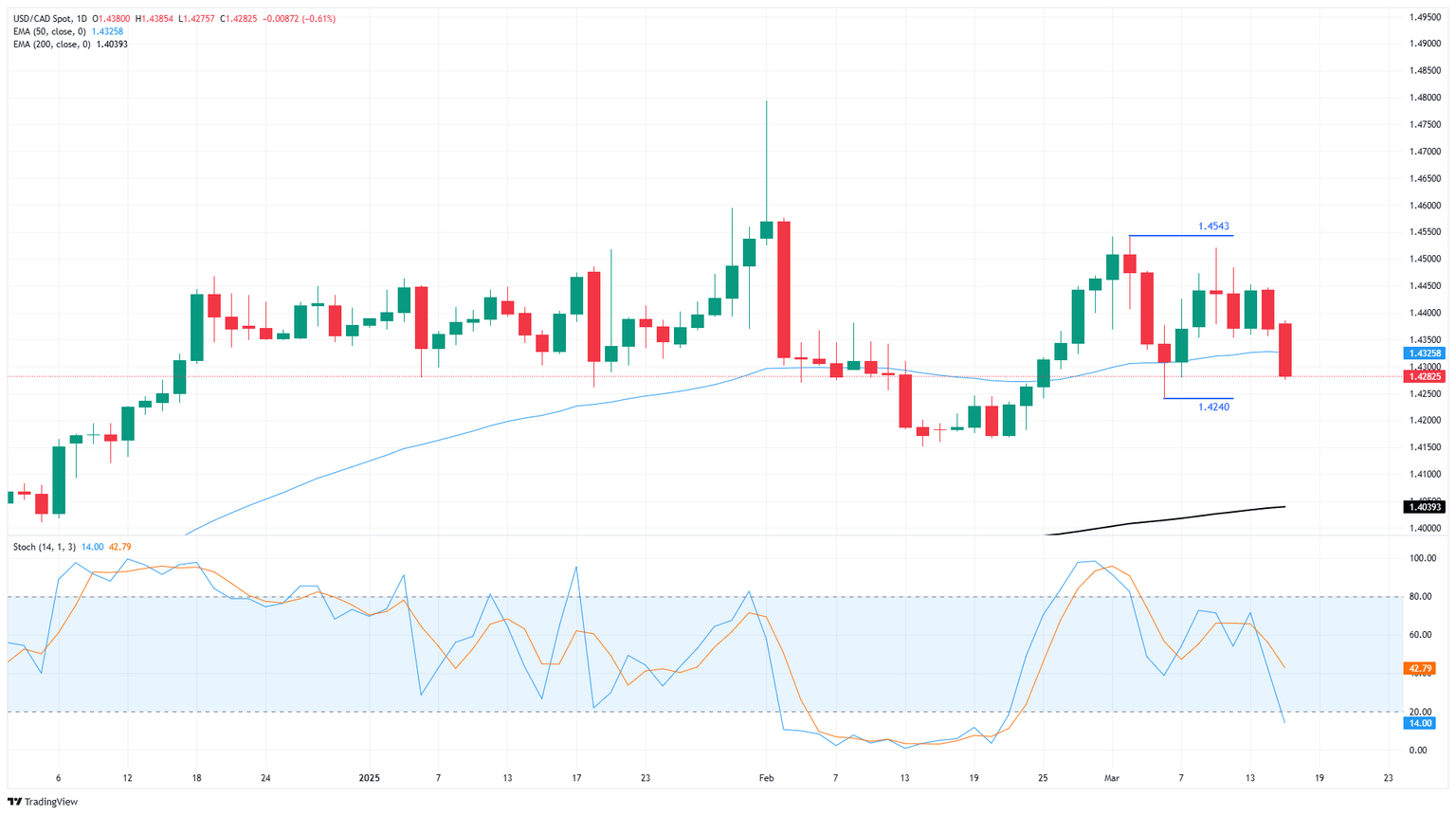 - The Canadian Dollar’s Monday rally pushed USD/CAD back below both the 1.4300 handle and the 50-day Exponential Moving Average (EMA) at 1.4325.