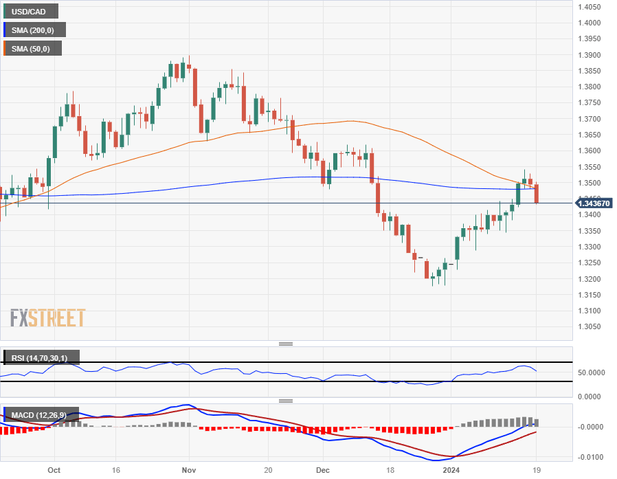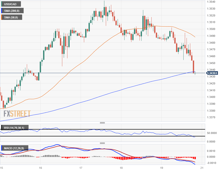 The US Dollar is down about a fourth of a percent against the Canadian Dollar on Friday after an intraday rejection from the 1.3500 level , and near-term momentum is seeing the USD/CAD drift back into the 200-hour Simple Moving Average (SMA) near 1.3430.