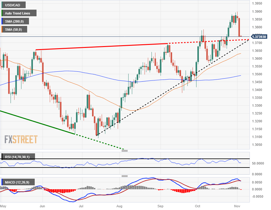 The USD/CAD pair fell back below the 1.3800 handle as the Canadian Dollar (CAD) follows market sentiment higher against the US Dollar (USD).