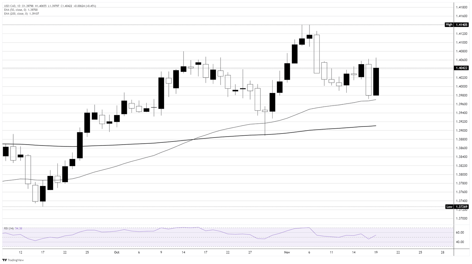 In the daily chart, USD/CAD trades at 1.4043. The pair holds above the rising 50-day EMA at 1.3970 and the 200-day EMA at 1.3911, reinforcing a bullish bias. The positive slope of both averages keeps the uptrend intact. RSI at 54 (neutral) is edging higher, signaling firming momentum.
