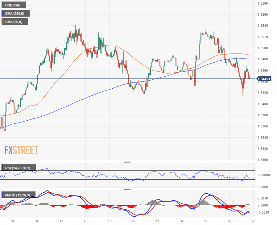 The Canadian Dollar pushed back against the US Dollar on Friday as USD/CAD fell to an intraday low of 1.3414, but a broad-market Greenback recovery pulled the pair back into the 1.3450 region.