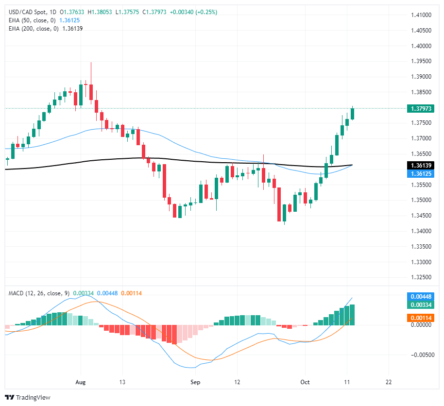 USD/CAD shows a clear bullish trend on the daily candlesticks, with the pair breaking above its 50-day Exponential Moving Average (EMA) near 1.3600, and is now trading into 1.3800.. The pair has risen steadily after a brief consolidation phase in mid-September, indicating strong upward momentum. The 50-day EMA is set to cross above the 200-day EMA, forming a bullish crossover known as a “golden cross,” which typically signals a long-term uptrend.