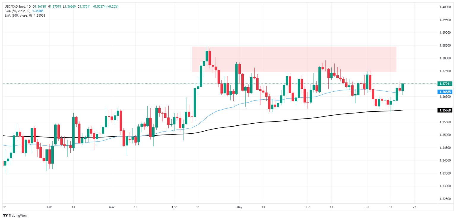USD/CAD has been given a leg back up into the 1.3700 handle, bolstering the pair up from an intraday swing low into the 200-hour Exponential Moving Average (EMA) at 1.3656. Near-term momentum has tilted into the bullish side in favor of the Greenback against the Canadian Dollar as CAD bidders disappear into the ether.
