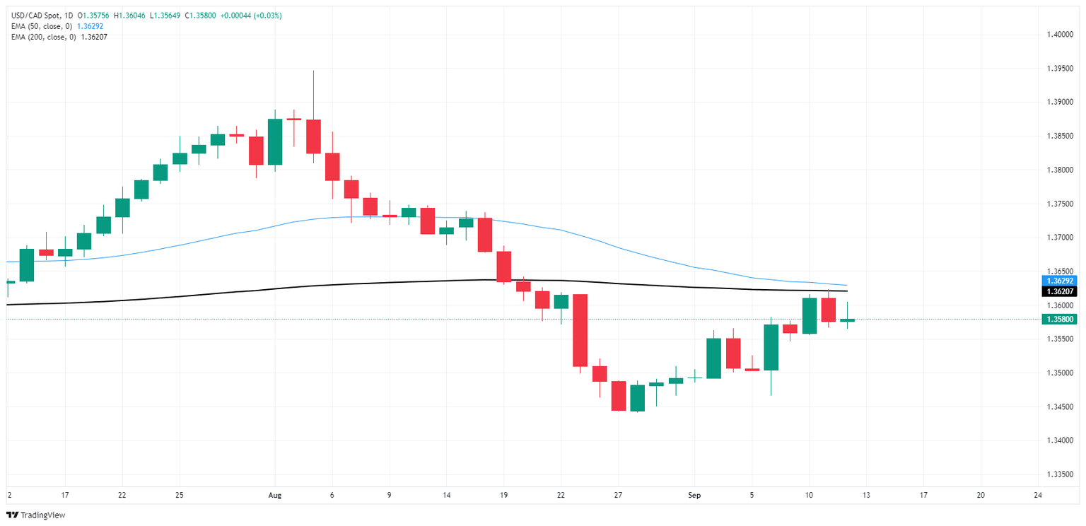 The Canadian Dollar (CAD) lost ground against all of its major currency peers on Thursday, tumbling back across the board and struggling to pump the brakes on a recent swing low against the US Dollar. USD/CAD is drifting in the middle of near-term technical congestion just south of the 200-day Exponential Moving Average (EMA) at 1.3623.