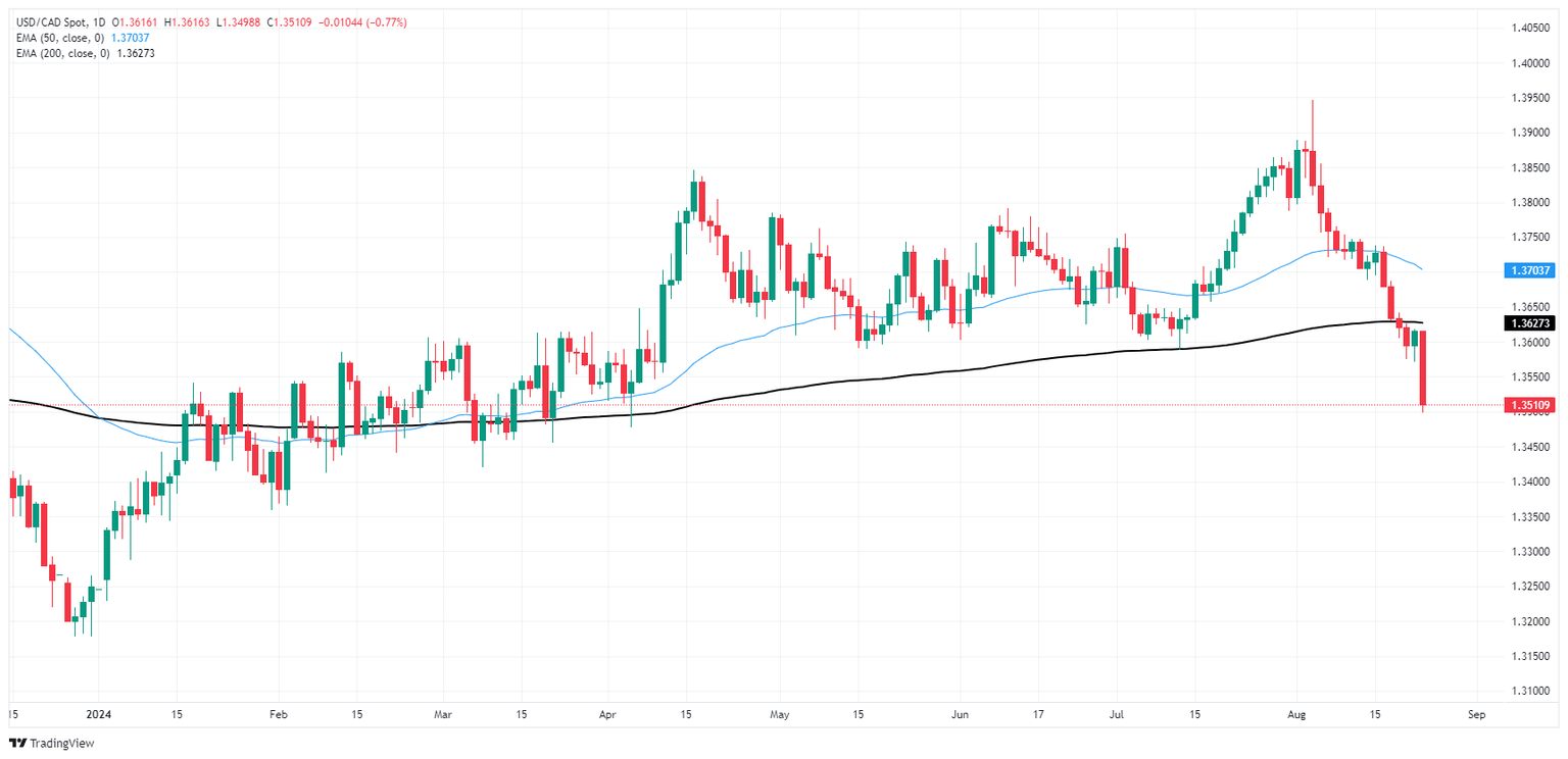 The US Dollar’s broad-market softening has sent the USD/CAD chart into a plunge that is picking up speed, extending below the 200-day Exponential Moving Average (EMA) near 1.3632. Shortsellers of the pair are firmly in control, but near-term exhaustion could be on the cards as price action rediscovers early 2024’s technical congestion zone.