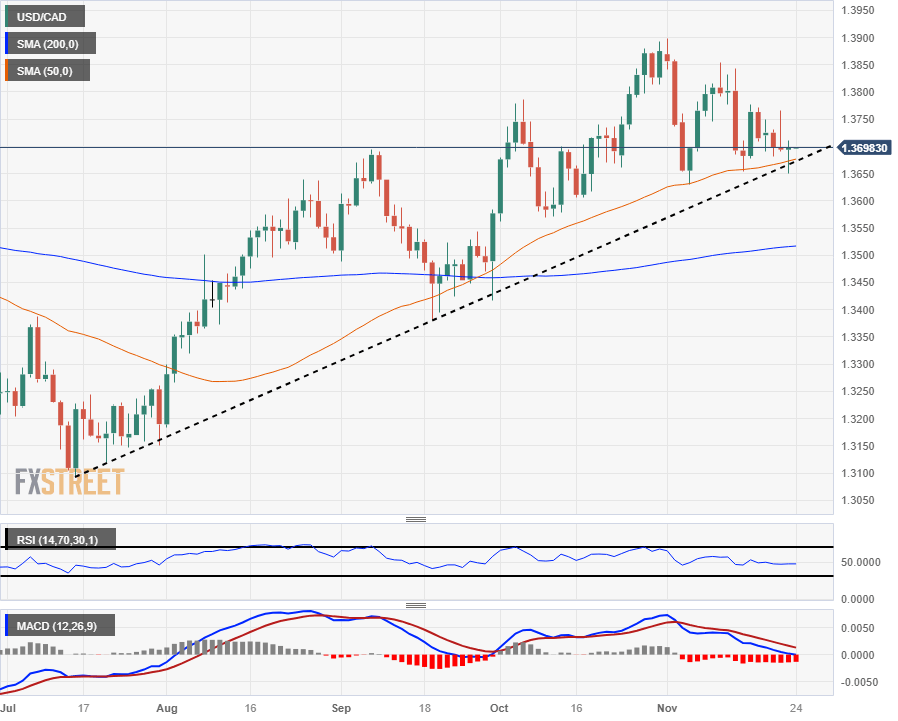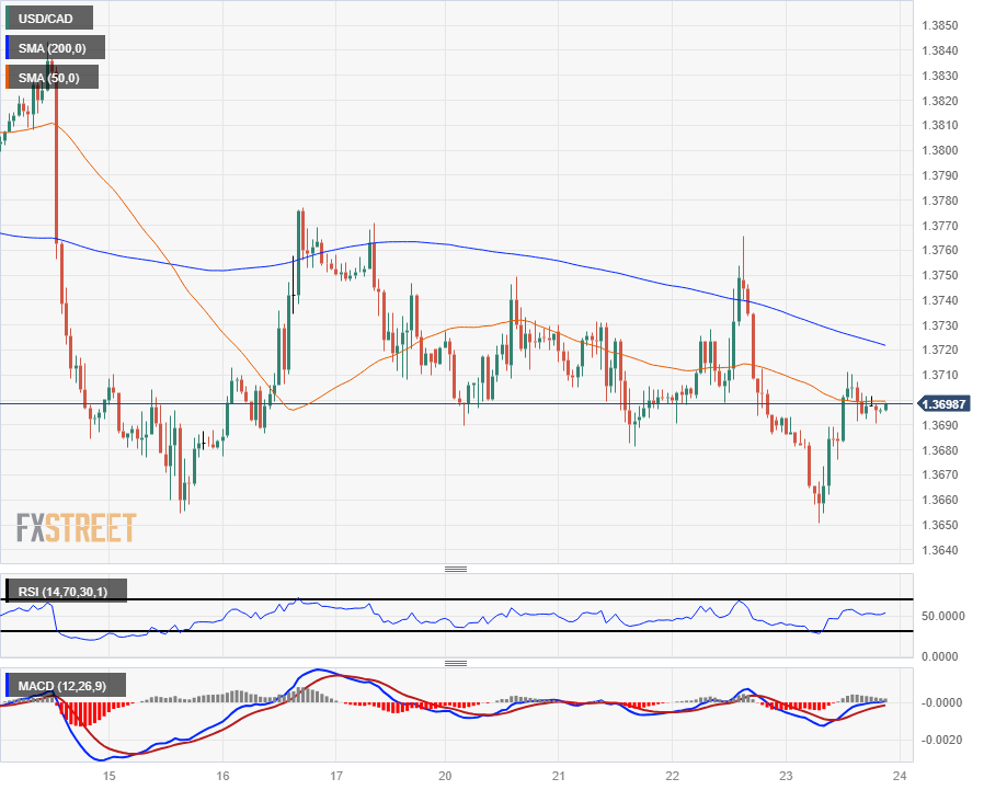 The USD/CAD briefly dipped into 1.3650 before getting pushed back into near-term median bids at the 50-hour Simple Moving Average (SMA). Intraday action continues to see constraint from the 200-hour SMA declining into 1.3720.