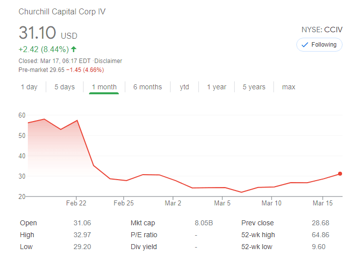 NYSE: CCIV has closed Tuesday's session at $31.10, an increase of 8.44% – the highest closing level since February 23. Can it continue higher from this three-week peak? It is essential to remember that Churchill's stock suffered a "buy the rumor, sell the fact" response after the SPAC move. with the peak level of $64.86 looking elusive.
