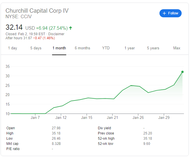 Afternoon Update February 4: CCIV shares recovered ground as Thursday progressed, breaking back above $30. CCIV had suffered on Wednesday, as a longer term outlook for any Lucid Motors merger was needed. Volume had been very high on Wednesday, with over 80 million shares trading, but returned to more average 2021 levels on Thursday. Volume is still elevated in CCIV for 2021 on the back of the Reddit retail boom. CCIV has been a stellar performer starting 2021 at $10!