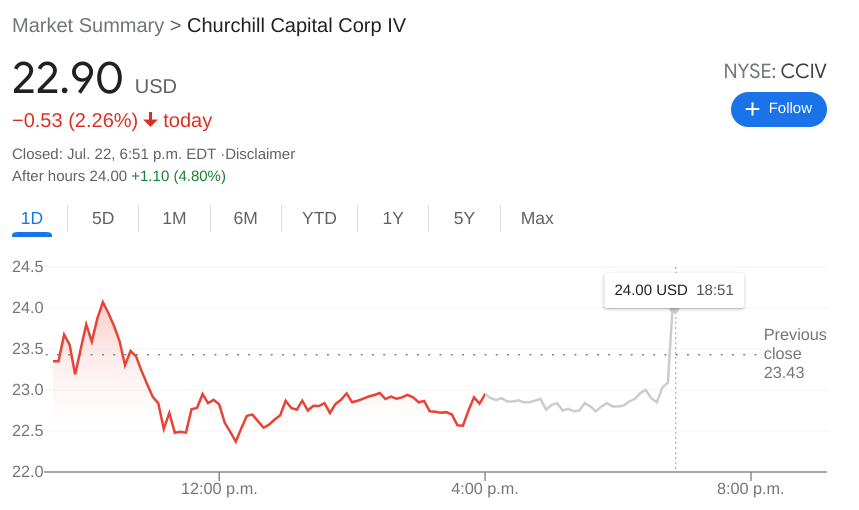 - NYSE:CCIV fell by 2.26% as the broader markets traded mostly flat on Thursday.