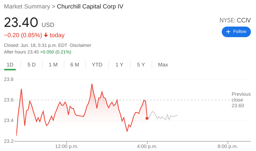 Update June 21: NYSE:CCIV lost 1.88% on Monday to close the day at $22.96 barely bouncing from an intrday low of $22.75. Wall Street posted a nice comeback after the post-Fed slump, with the NYSE Composite Index up 265 points or 1.64%. The Dow Jones Industrial Average added roughly 600 points, the largest daily advance this year.
