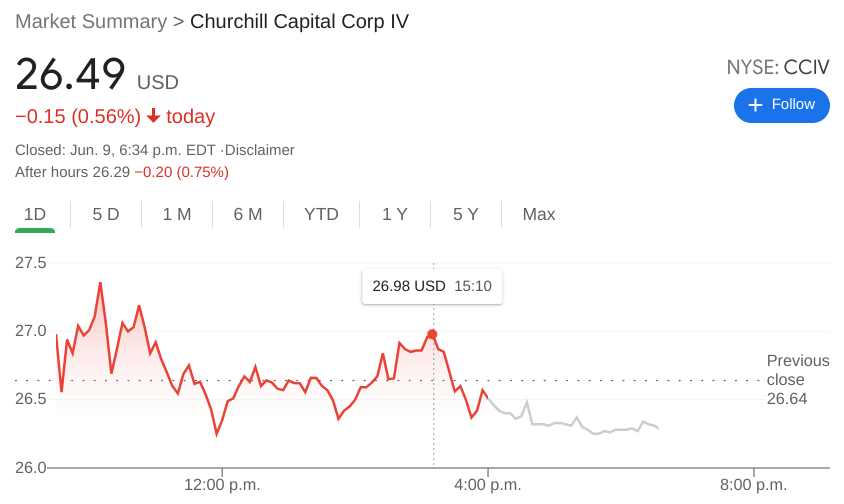 NYSE:CCIV has finally seen its recent resurgence come to an end as the broader markets pulled back on Wednesday. Shares of CCIV dipped by 0.56% to close the day at $26.49, as the red-hot SPAC stock took a mid-week breather. The stock has gained an impressive 17% over the past week as things have started to heat up in terms of merger rumors with Lucid Motors. Shares are still down nearly 245% from the all-time high price of $64.86, so there are definitely some investors who are interested in seeing the price of the stock significantly rise from current price levels.