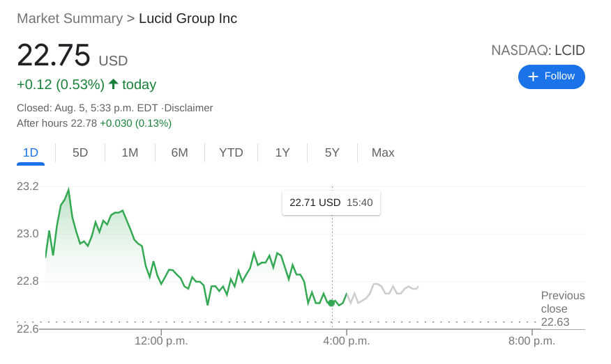 NASDAQ:LCID hasn’t quite had the Wall Street debut its investors were looking for after its merger closed at the end of July. On Thursday, shares of LCID added 0.53% to close the trading day at $22.75. It was a positive day for the markets overall, so the fact that Lucid lagged the S&P 500 and NASDAQ is not exactly a bullish outlook. Shares jumped early in trading and hit as high as $23.29, but anything above $23.00 was acting as resistance and the stock got knocked back down by the closing bell.