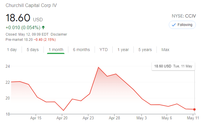 NYSE:CCIV has been a hot topic among SPAC investors, even as the SEC seeks to institute more regulations around the popular merger vehicle. On Tuesday, CCIV continued its downward descent as the stock fell 0.2% to close the trading day at $18.60. CCIV’s march back to its $10 NAV price has been steady since the stock skyrocketed on the news of its merger with Lucid Motors back in February. Along with other SPAC stocks, CCIV has fallen out of favor with investors as several prominent companies that came public via the SPAC merger have since fallen well below the $10 share price.